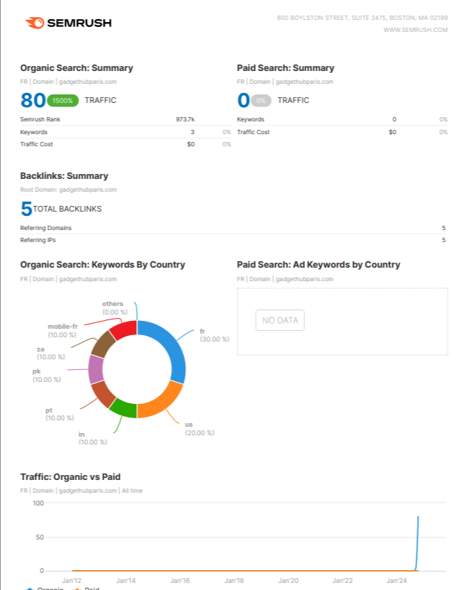 In 2024, a comprehensive SEO strategy was implemented for Gadget Hub Paris to enhance its online visibility, attract targeted traffic, and boost sales. The key areas of focus included: